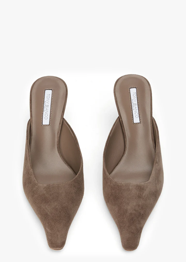 Unlock effortless sophistication with Juniper, a striking pointed-toe mule that prioritises texture and form. This standout slip-on is defined by its suede leather, featuring a matte finish that brings a soft edge to a classic silhouette. Balanced on a sculptural flared heel, this mule serves as the essential women’s ashen suede mule heel for those who demand a blend of modern artistry and everyday ease.